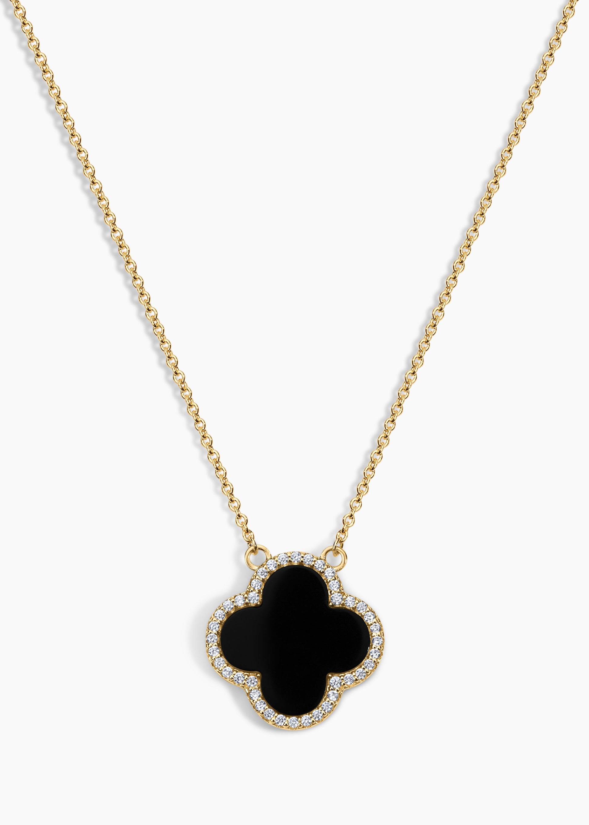 The Icon Black Necklace is all about contrast. A dark, glossy clover pops against its gold frame, with a halo of sparkles adding the perfect hint of drama. Pair it with the matching bracelet to complete the look.