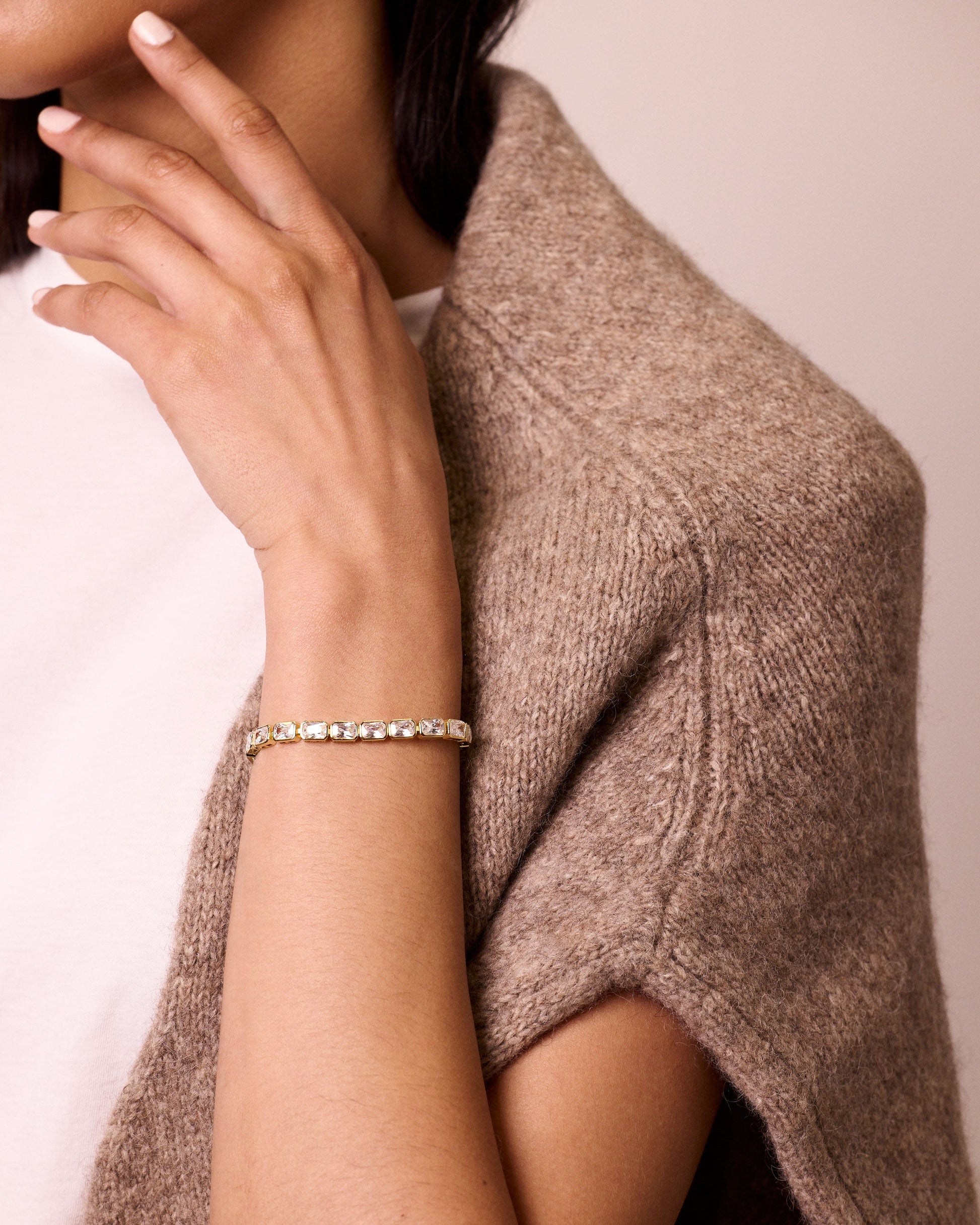 We're just picking our jaws up from off the floor because the Prescott Bracelet has us speechless. With radiant -cut crystals set in 14kt gold plating, this piece has sparkle for days (and days...and days...and days...)