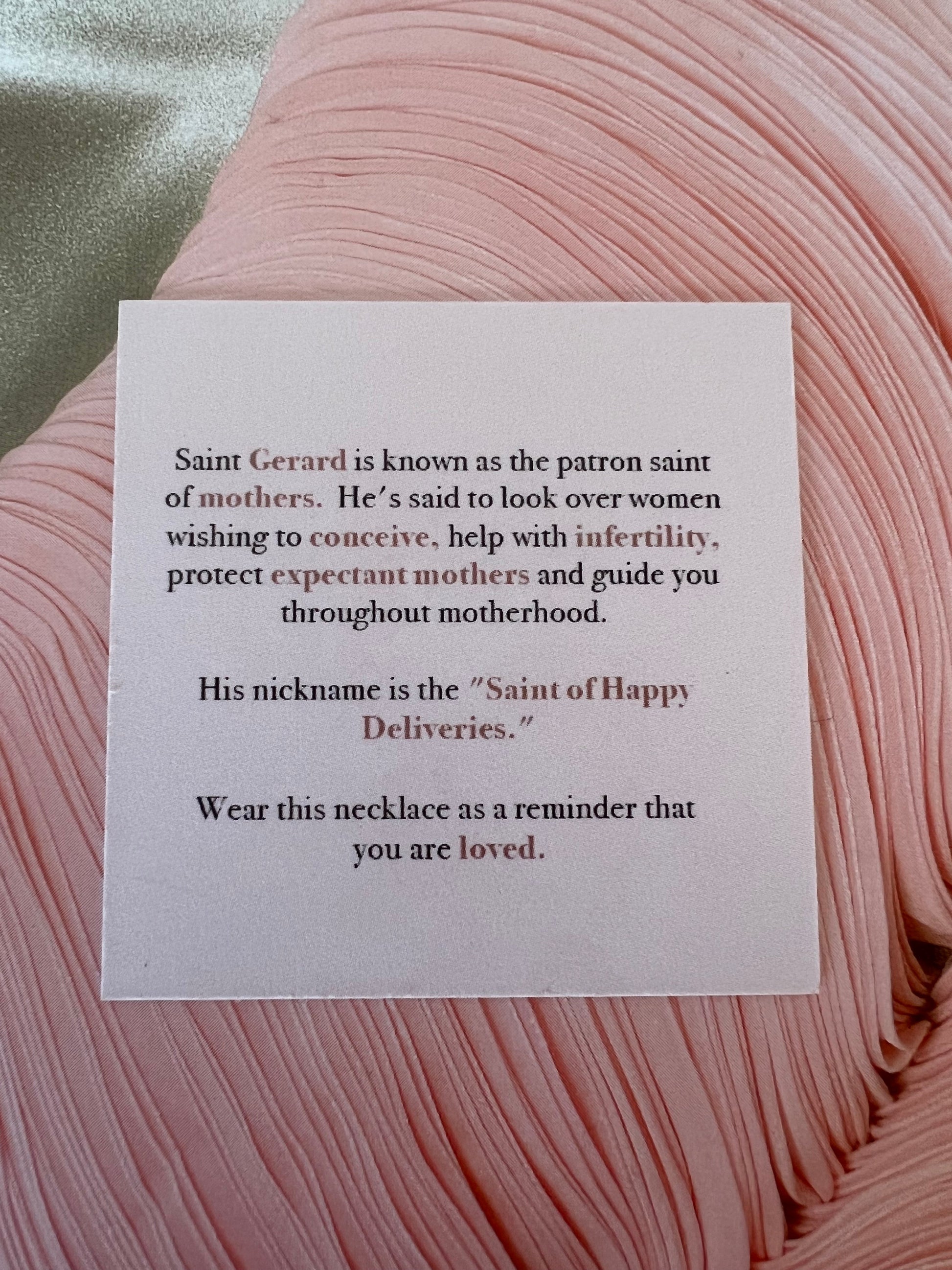 About Saint Gerard: Saint Gerard is known as the patron saint of mothers. He's said to look over women wishing to conceive, help with infertility, protect expectant mothers, and guide you throughout motherhood. His nickname is the "Saint of Happy Deliveries." Wear this necklace as a reminder that you are loved.