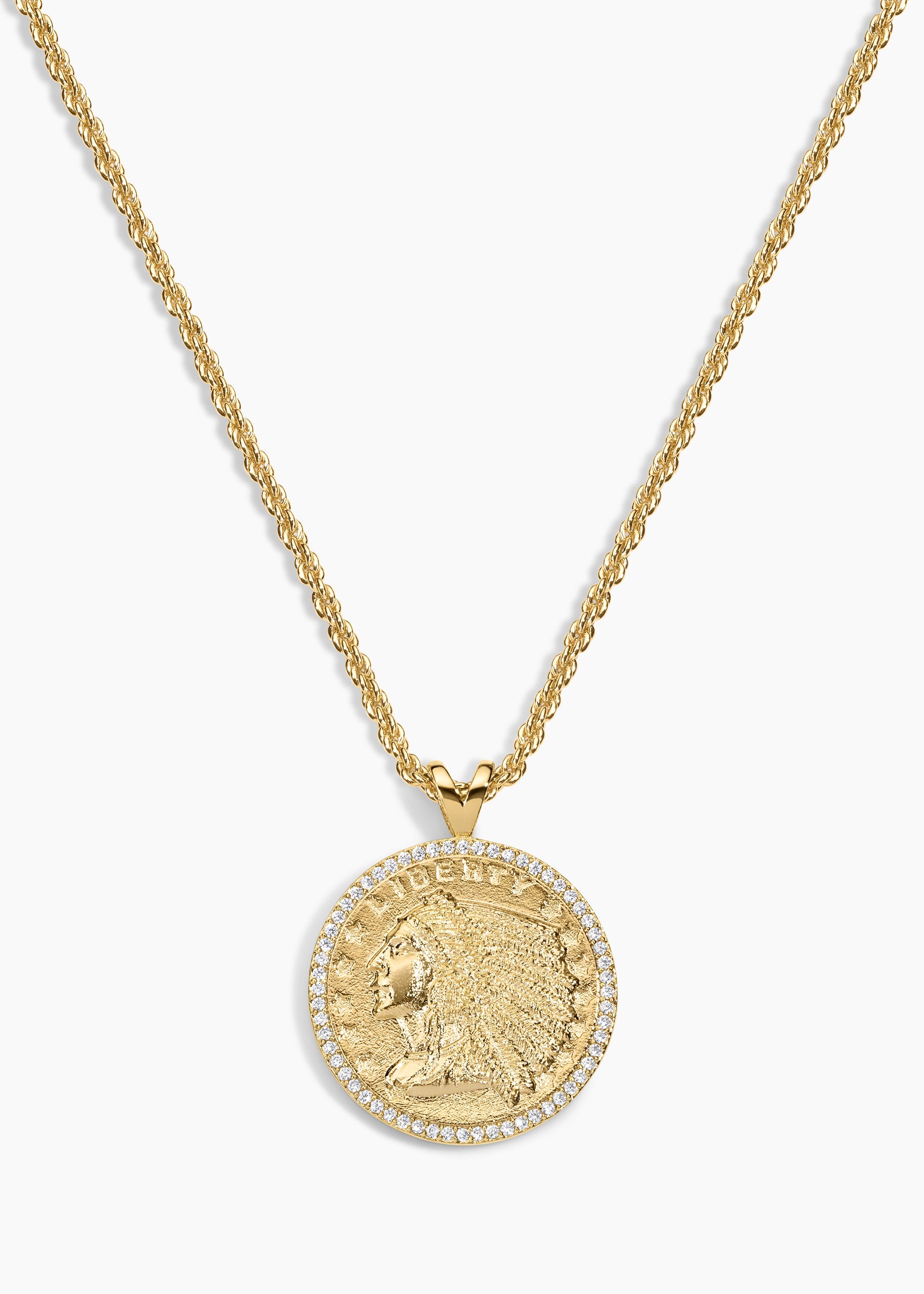 Why carry change when you can wear it? Our Sovereign Necklace features a rope chain and a coin pendant surrounded by sparkle. Inspired by the iconic Liberty coin designs of the early 1900s, it’s a modern classic that stands out in any stack!